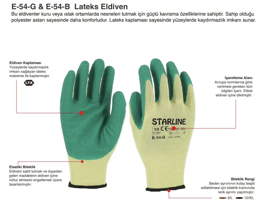 Bu eldivenler kuru veya ıslak ortamlarda nesneleri tutmak için güçlü kavrama özelliklerine sahiptir. Sahip olduğu polyester astarı sayesinde daha konforludur. Lateks kaplaması sayesinde yüzeylerde kaydırmazlık imkanı sunar.