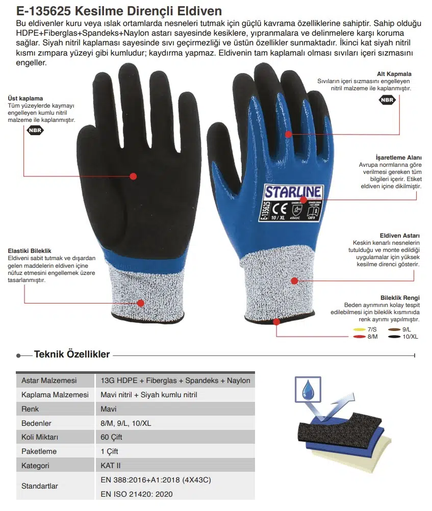 Bu eldivenler kuru veya ıslak ortamlarda nesneleri tutmak için güçlü kavrama özelliklerine sahiptir. Sahip olduğu HDPE+Fiberglas astarı sayesinde kesiklere, yıpranmalara ve delinmelere karşı koruma sağlar. Siyah nitril kaplaması sayesinde sıvı geçirmezliği ve üstün özellikler sunmaktadır. İkinci kat siyah nitril kısmı zımpara yüzeyi gibi kumludur; kaydırma yapmaz. Eldivenin tam kaplamalı olması sıvıları içeri sızmasını engeller.