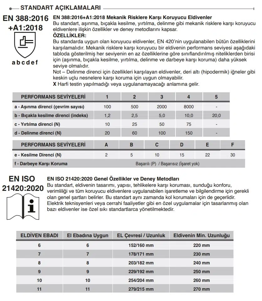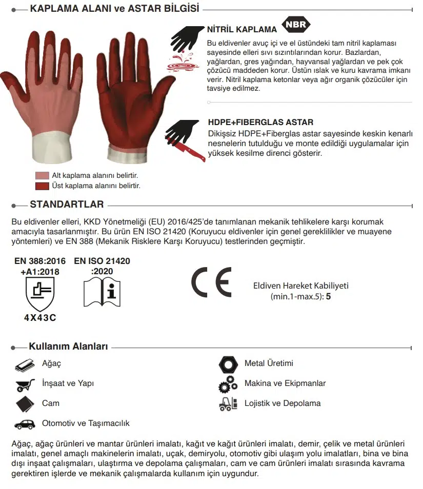 Bu eldivenler avuç içi ve el üstündeki nitril kaplama sayesinde elleri sıvı sızıntılarından korur. Bazlarda yağlardan ve pek çok çözücü maddeden elleri korur. Ürün ıslak ve kuru kavrama imkanı verir. Nitril kaplama ketonlar ve ağır organik çözücüler için önerilmez.