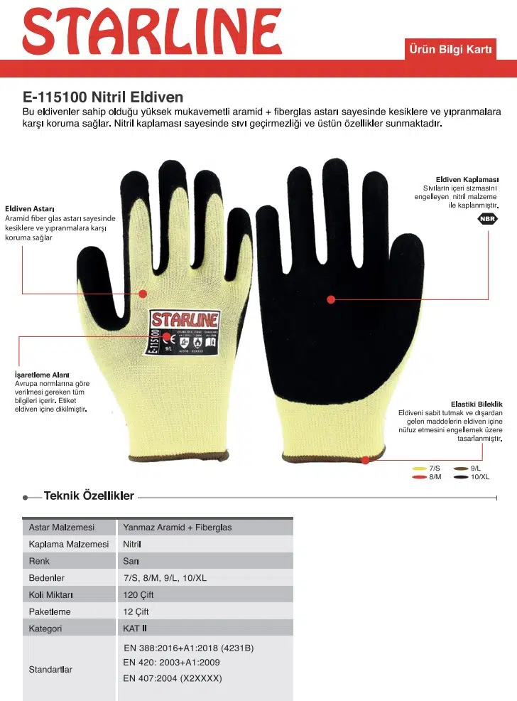Nitril Kaplamalı Aramid Eldiven Starline E-115100 4231b X2xxxx (P) Beden 10