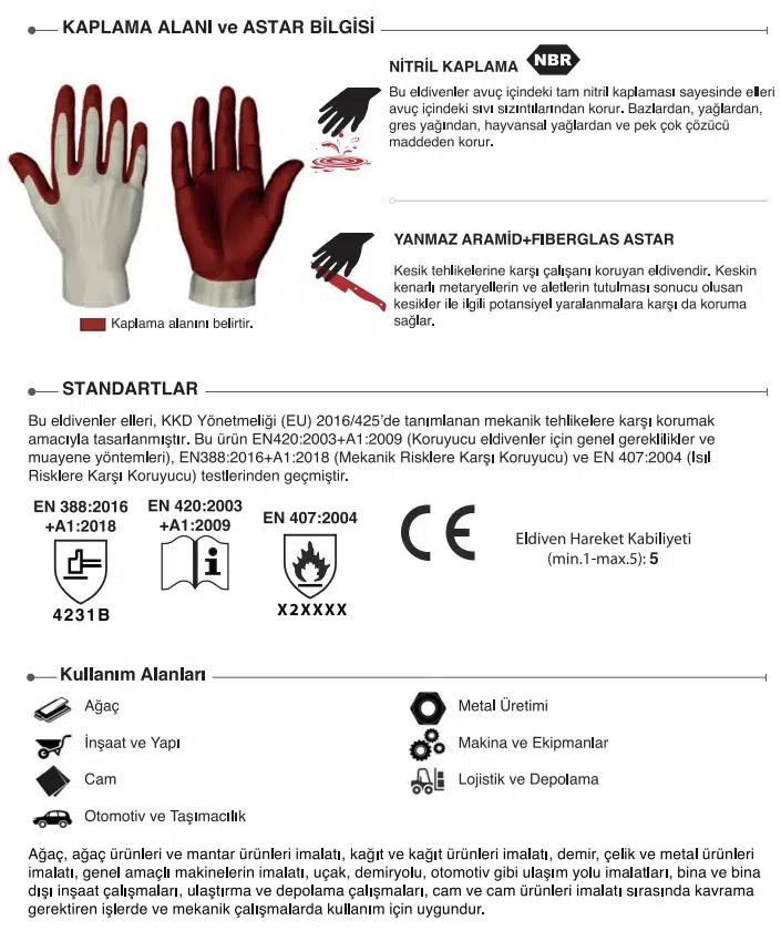Bu eldivenler sahip olduğu yüksek mukavemetli yanmaz aramid+fiberglas astarı sayesinde kesiklere ve yıpranmalara karşı koruma sağlar. Keskin kenarlı metaryellerin ve aletlerin tutulması sonucu olusan kesikler ile ilgili potansiyel yaralanmalara karşı da koruma sağlar. Nitril kaplaması sayesinde sıvı geçirmezliği ve üstün özellikler sunmaktadır.