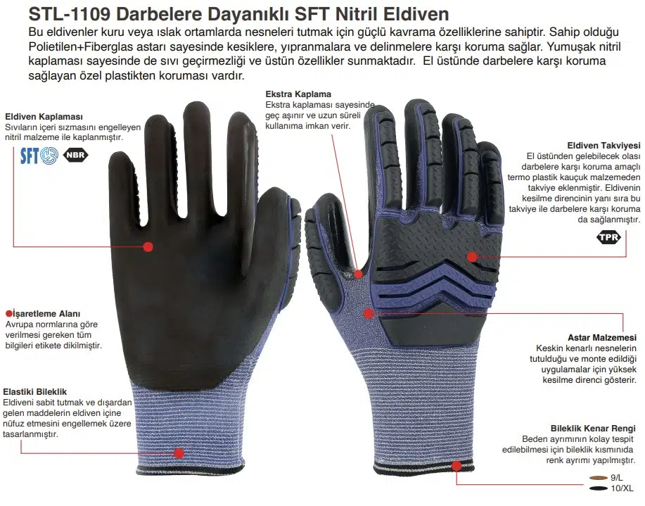 Bu eldivenler kuru veya ıslak ortamlarda nesneleri tutmak için güçlü kavrama özelliklerine sahiptir. Sahip olduğu Polietilen+Fiberglas astarı sayesinde kesiklere, yıpranmalara ve delinmelere karşı koruma sağlar. Yumuşak nitril kaplaması sayesinde de sıvı geçirmezliği ve üstün özellikler sunmaktadır. El üstünde darbelere karşı koruma sağlayan özel plastikten koruması vardır.
