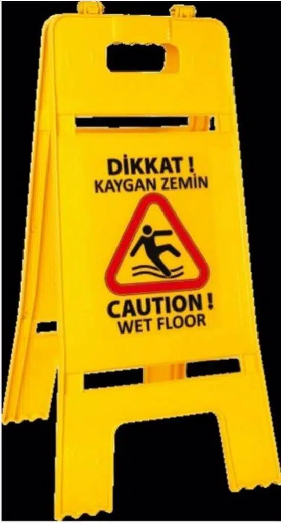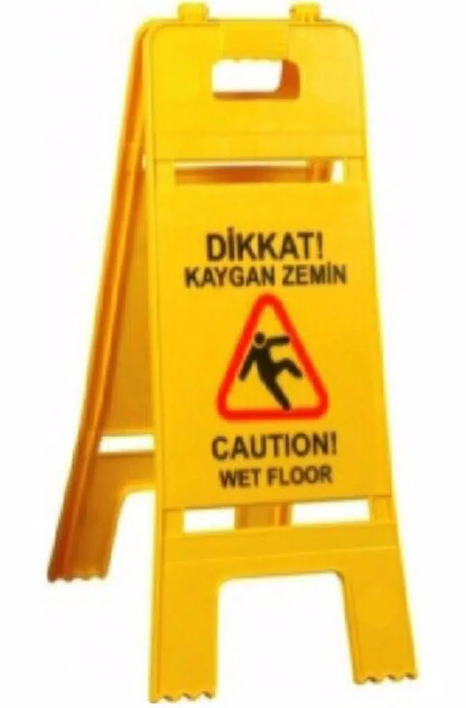 Her iki yüzeyde de DİKKAT! KAYGAN ZEMİN ve CAUTION WET FLOOR yazılıdır.