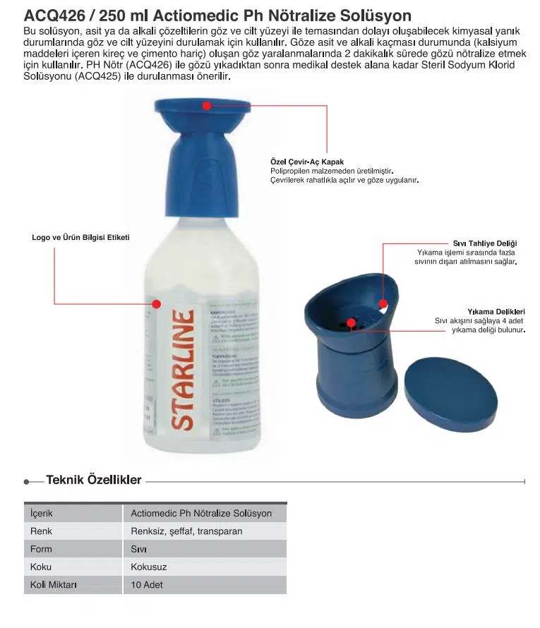 Bu solüsyon, asit ya da alkali çözeltilerin göz ve cilt yüzeyi ile temasından dolayı oluşabilecek kimyasal yanık durumlarında göz ve cilt yüzeyini durulamak için kullanılır. Göze asit ve alkali kaçması durumunda (kalsiyum maddeleri içeren kireç ve çimento hariç) oluşan göz yaralanmalarında 2 dakikalık sürede gözü nötralize etmek için kullanılır. PH Nötr (ACQ426) ile gözü yıkadıktan sonra medikal destek alana kadar Steril Sodyum Klorid Solüsyonu (ACQ425) ile durulanması önerilir