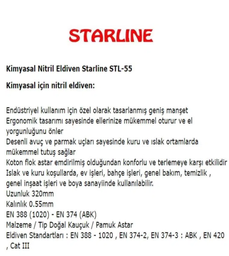 | Etiketler | Kimyasal Nitril Eldiven Starline Stl-55 (8-8,5 Numara)10 Çift |