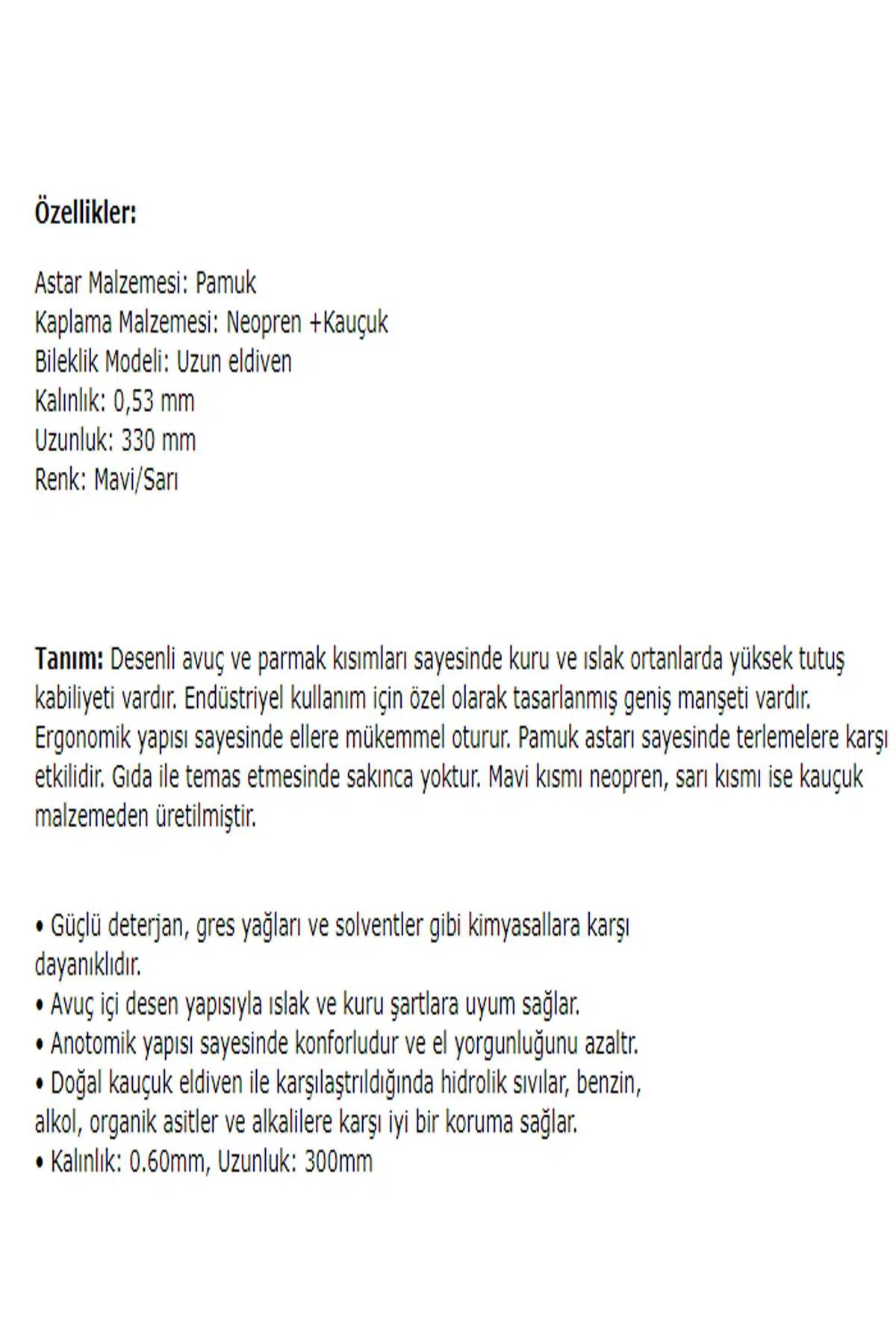 Tanım: Desenli avuç ve parmak kısımları sayesinde kuru ve ıslak ortanlarda yüksek tutuş kabiliyeti vardır. Endüstriyel kullanım için özel olarak tasarlanmış geniş manşeti vardır. Ergonomik yapısı sayesinde ellere mükemmel oturur. Pamuk astarı sayesinde terlemelere karşı etkilidir. Gıda ile temas etmesinde sakınca yoktur. Mavi kısmı neopren, sarı kısmı ise kauçuk malzemeden üretilmiştir.