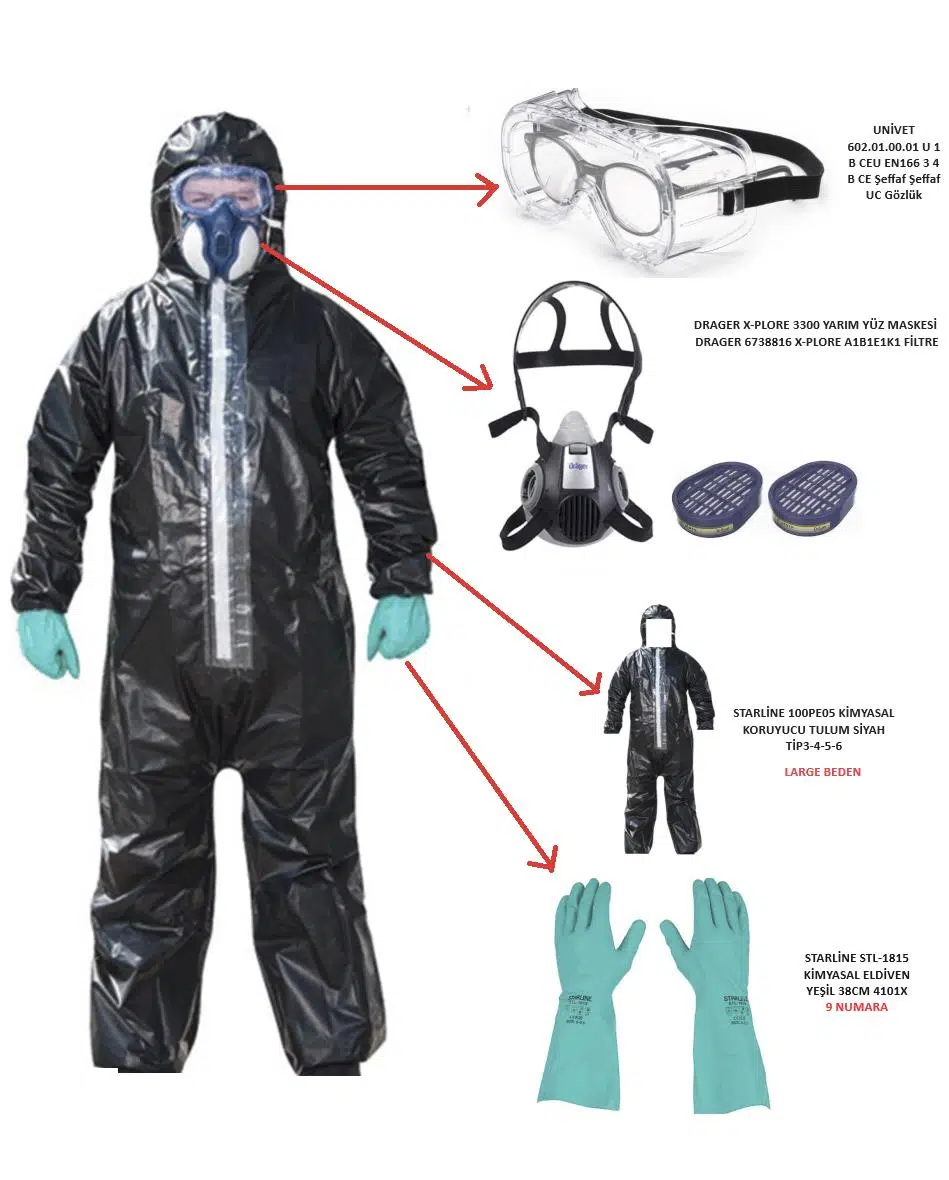 Etiketler | Tehlikeli Kimyasal İle Çalışmalarda Tam Koruma Set Starline Tulum Eldiven Drager Maske Univet Google Gözlük |